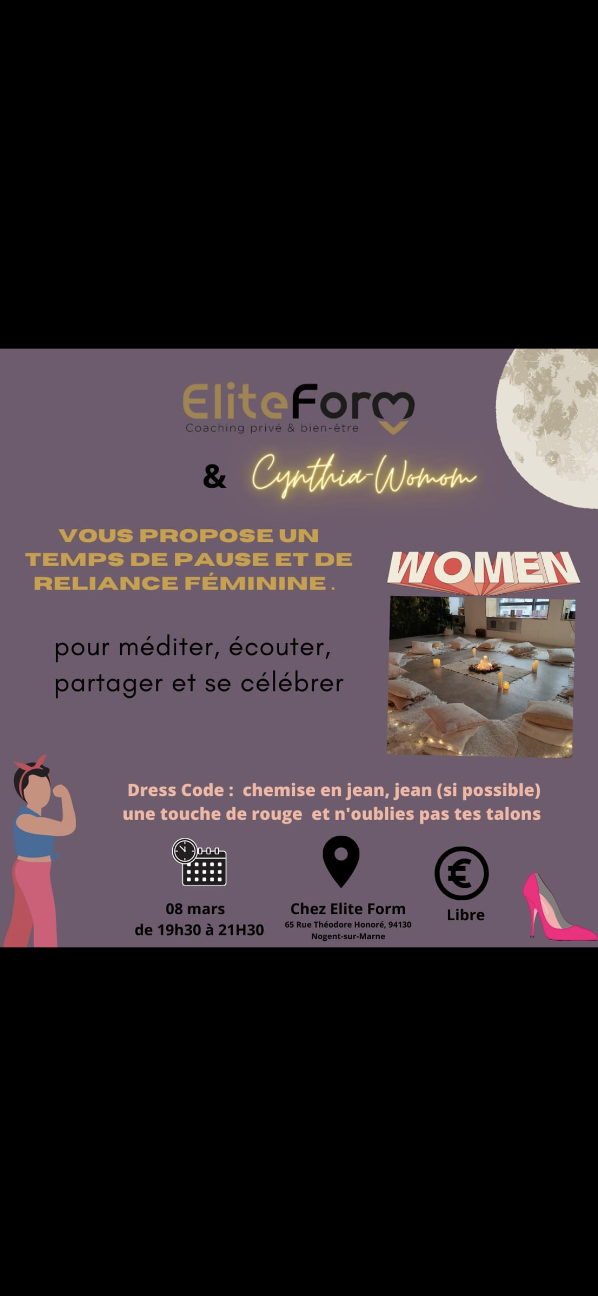 Nous vous attendons nombreuses le 8 mars. Elite Form sera ouvert uniquement pour nous toutes avec pour seule présence masculine celle de Samuel (The coach). Nous espérons que vous pourrez vous joindre à nous pour cette journée inoubliable. Nous avons hâte de partager cette expérience unique avec vous dans notre salle.