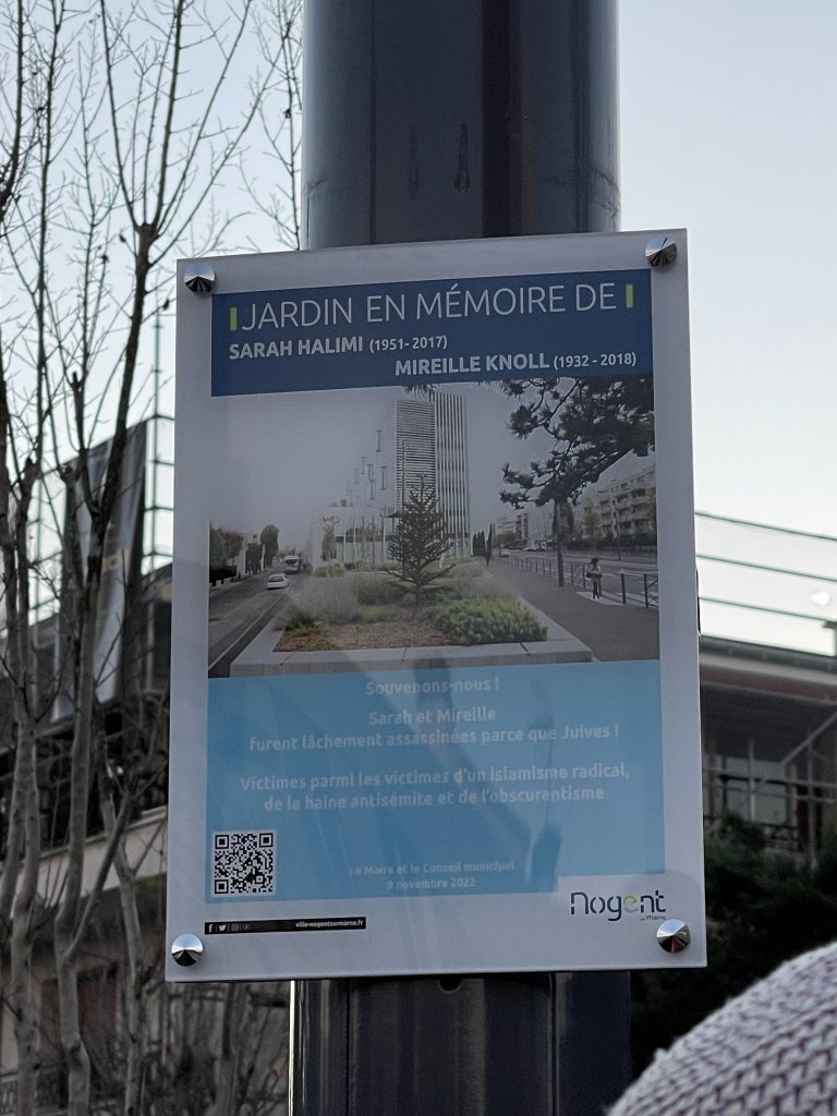 Le jardin créé en mémoire de Sarah Halimi et de Mireille Knoll, situé à l’angle de l’avenue des marronniers et de l’avenue de Joinville, a été inauguré le mercredi 9 novembre 2022 par Jacques J.P. Martin et les membres des familles des deux victimes, William Attal (frère de Sarah Halimi) et Daniel et Allan Knoll (fils de Mireille Knoll). Plusieurs centaines de personnes et de nombreux officiels et élus locaux avaient répondu présents à l’appel de la Municipalité : Madame Yael German, Ambassadrice d’Israël, Monsieur le Sous-Préfet Bachir Bakhti, Monsieur le Député Mathieu Lefèvre, le Conseil Municipal de Nogent ainsi que de nombreux élus locaux des villes du territoire ParisEstMarneBois et au-delà. Toutes les confessions et communautés étaient également représentées pour ce moment chargé en émotion.